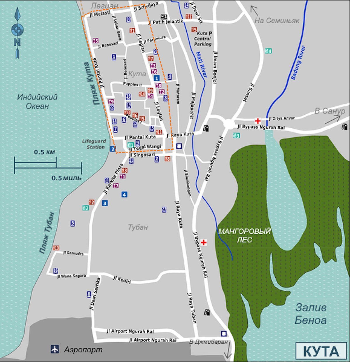 Широкая и длинная песчаная полоса пляжа в Куте считается одной из лучших на Бали. Пляж безопасный и в большинстве своем чистый (не считая мусора после шторма😱 особенно во время сезона дождей). Здесь так же, как и во многих туристических центрах присутствуют назойливые торговцы, которые предлагают массаж, плетение косичек, крепкие сигареты с гвоздикой и доски для серфинга, но с этим быстро смиряешься и относишься, как даже к некоему необходимому антуражу. Пляж полон загорающих, а ближе к воде и в ней — множество любителей попробовать доску: серф-культура для новичков здесь бьет ключом. Район южной Куты, ближайший к аэропорту — называется Тубан, он более спокойный и это не совсем та Кута, которая нас интересует. Если вы хотите в эпицентр событий — селитесь недалеко от оси Sky Garden — BeachWalk. На карте далее самый интересный «прямоугольник» Куты отмечен оранжевым пунктиром.