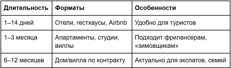 - Туристы: предпочитают краткосрочную аренду, удобство, близость к пляжам.
