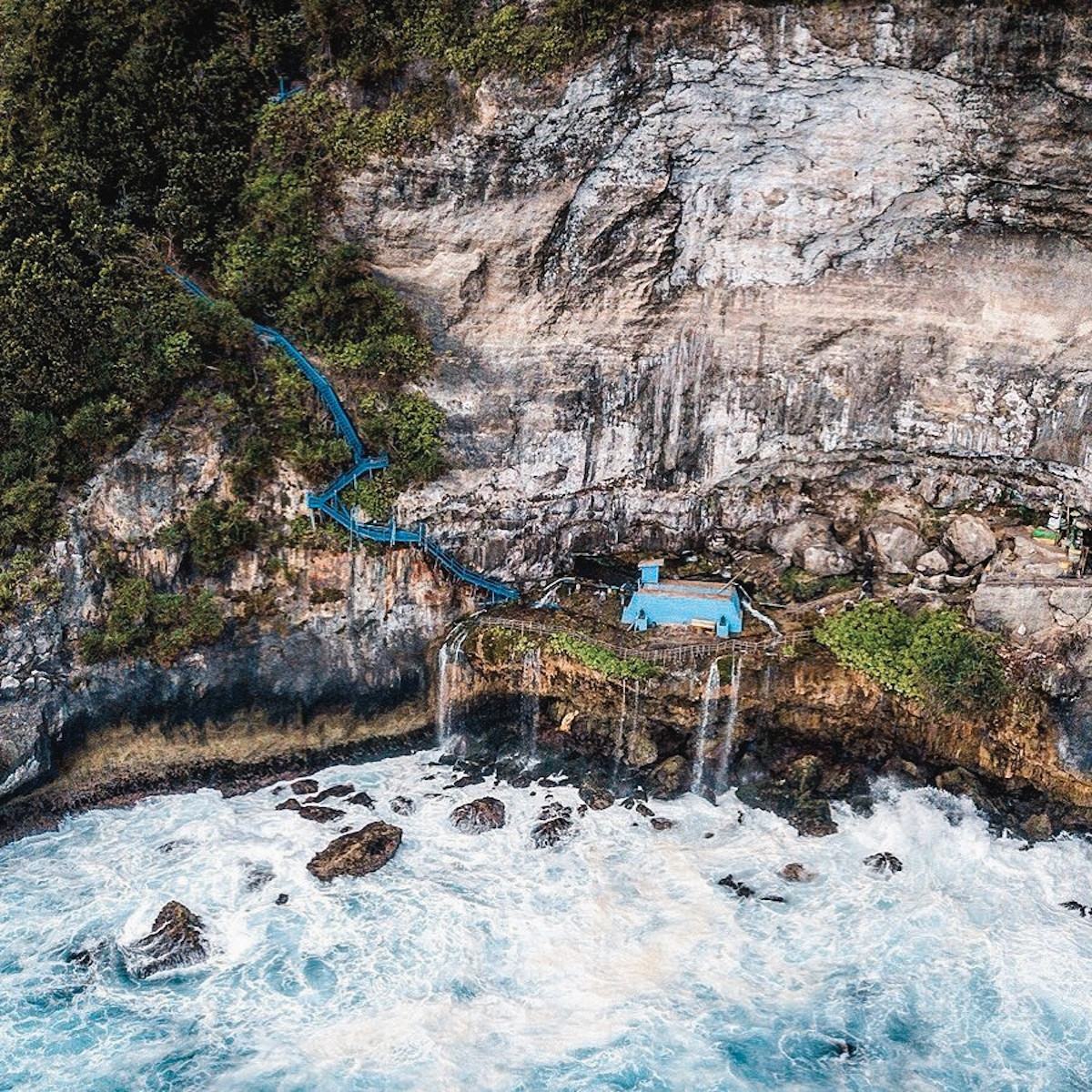 Это не водопад в классическом понимании: воды здесь немного, и она стекает по скале тонкими струйками прямо в море. Но настоящая ценность этого места — путь к нему. Чтобы добраться до воды, нужно спуститься по знаменитой синей лестнице, прикрепленной к отвесной скале — это около 700 узких и крутых ступеней вниз, над пропастью. На нижнем уровне находится маленький храм, место паломничества местных. Вид на океан с этой точки один из самых драматичных на всём острове. А еще здесь замечают стаи мант, которые хорошо просматриваются с высоты.