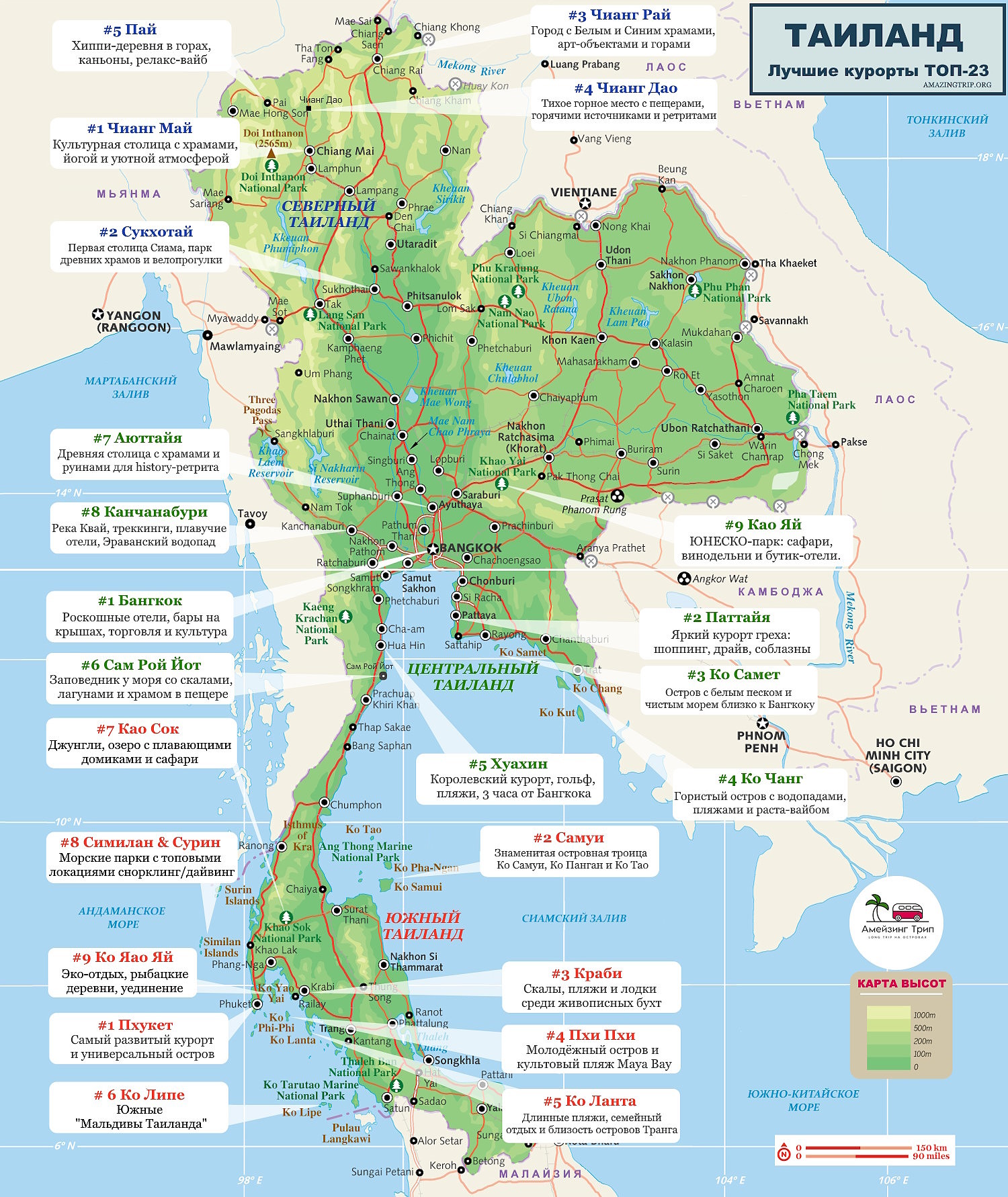 Энергичный Бангкок — центр тайской вселенной, религии, монархии, роскошной жизни и деловой активности. Древние столицы Аюттайя и Сукхотай усеяны остатками величественных монументов прошлого. Север Таиланда венчает страну зелёными горами, медитативными центрами и культурными анклавами. Куда бы вы ни отправились — местная кухня, в которой тайцы создают вкусовое пиршество из простых ингредиентов не оставит вас и это отдельное приключение: ароматные кокосовые карри на юге, дымящиеся миски лапши в Бангкоке и сытные рагу в Чианг Мае. В этом обзоре лучшие курорты Таиланда разделены между тремя частями страны: юг, центр, север — и это наш ТОП-23 мест для отдыха от островов до горных ретритов.
